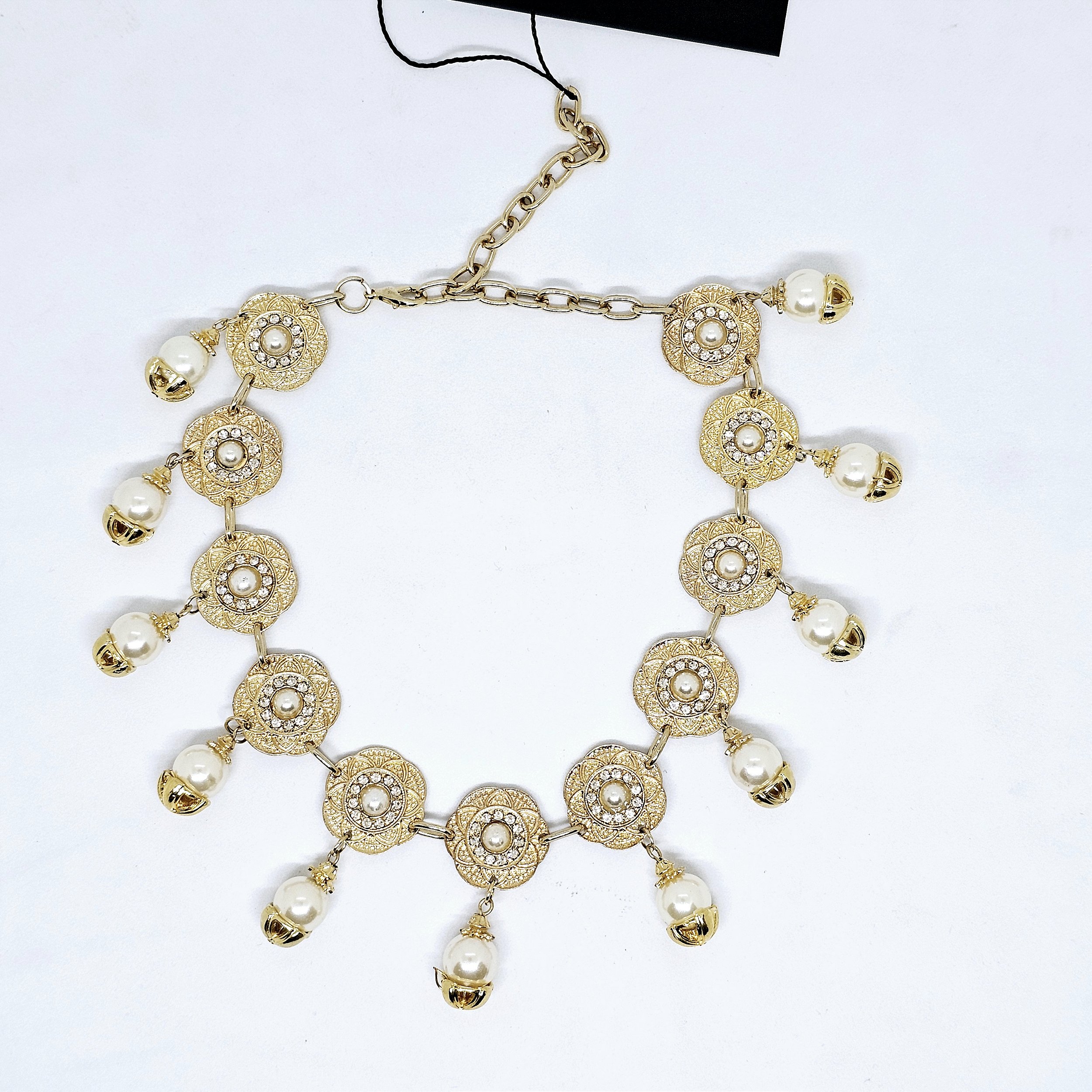 Colar em fundição de flor, com cabochon de pérola, e strass. com pinduricalho de pérola