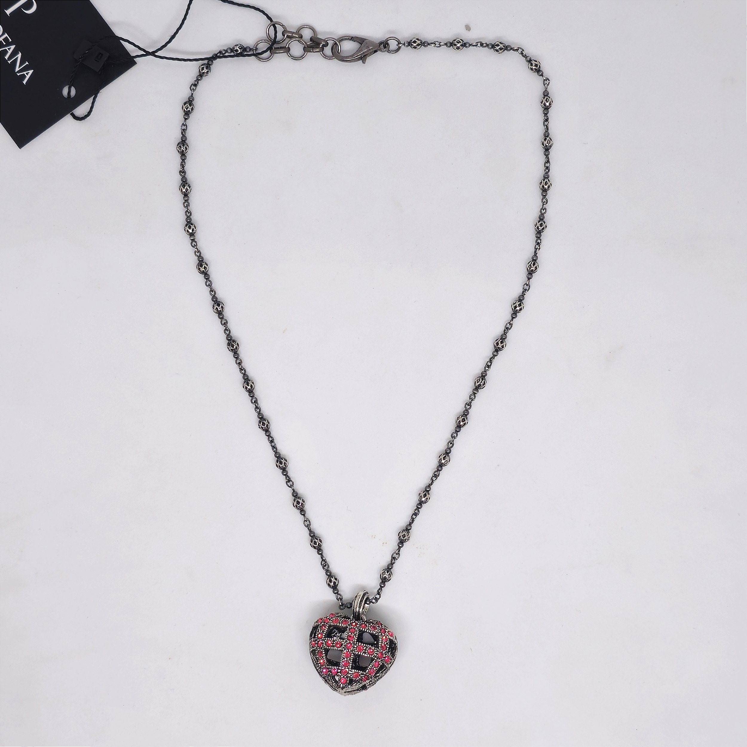 Colar em corrente trabalhada em crosone rendado grafite, com pingente coração 3D grafite com strass Pink