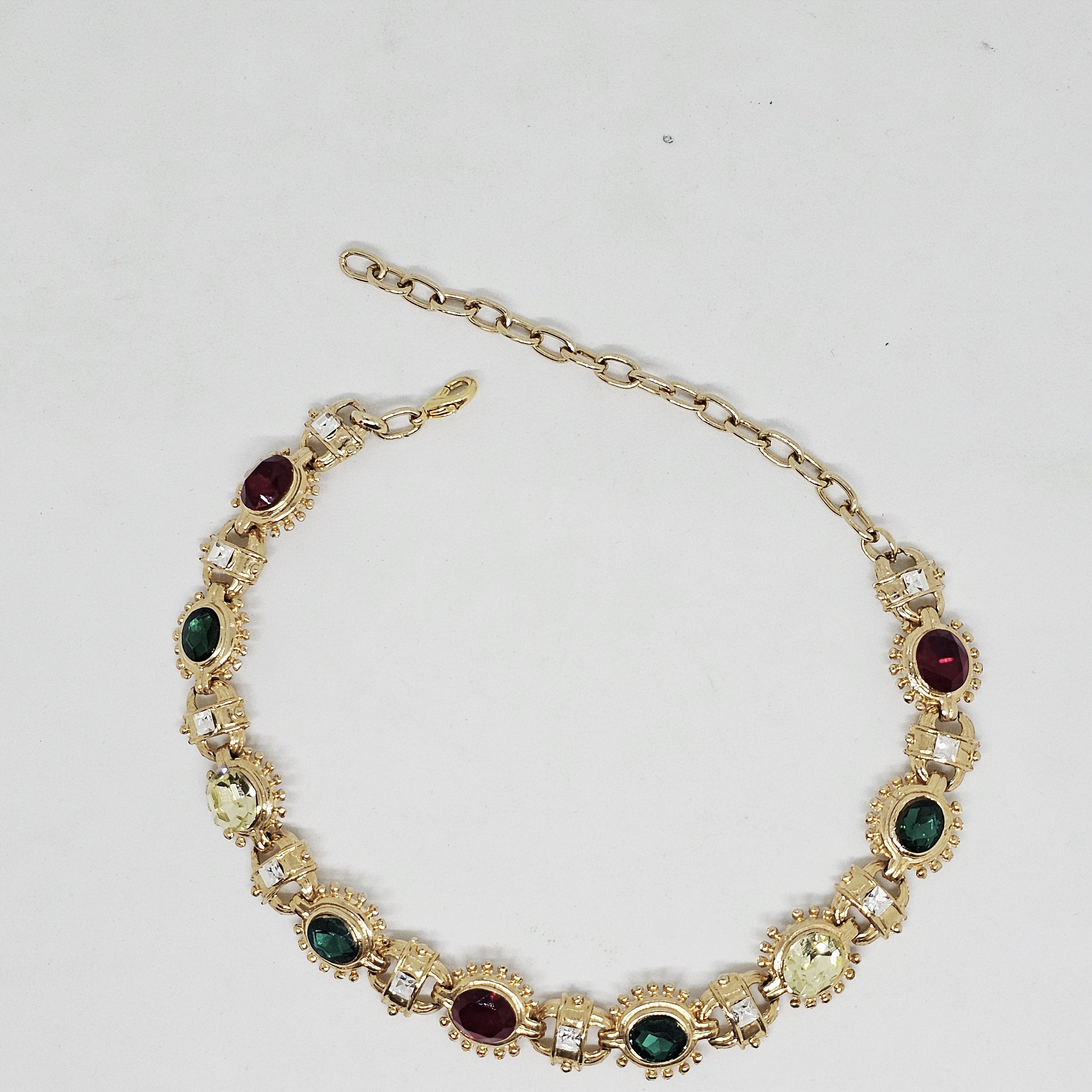 Gargantilha/choker em fundição dourada, e strass policromatico, nas cores: vermelho sian, verde esmeralda, citrino, intercalados com strass quadrado cristal.